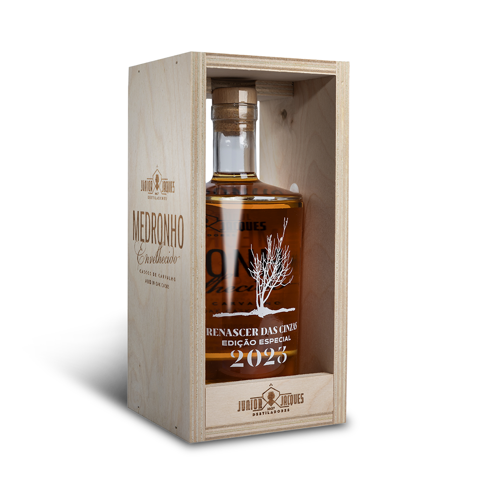 Renascer das Cinzas Uma edição especial que conta o nosso reerguer após os fatídicos incêndios que afetaram a nossa produção e a de muitos produtores da Costa Vicentina e do Sudoeste Alentejano. Produzido com fruta madura colhida no Outono, este produto foi destilado artesanalmente num pequeno alambique de cobre e num estágio subtil de 6 meses em cascos de Carvalho. Feito do esforço do nosso regresso, mas orgulhosos da tradição que sempre cá mora, é feito exclusivamente a partir do fruto do medronheiro, com um complexo aroma a frutos secos, madeira e especiarias. Ao paladar é delicado, suave e surpreendentemente frutado, onde o sabor do medronho se funde com outros aromas exóticos. O final é prolongado, com notas persistentes a carvalho e especiarias. Um destilado superior que pode ser apreciado de forma simples ou com gelo. Disponível em 500mL.