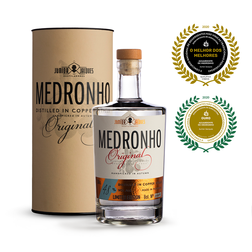 A essência da aguardente de Medronho. Júnior Jacques Medronho Original Reserva segue a receita das tradições e gerações antes a ela. Com o fruto do medronho criámos uma aguardente requintada, suave e com um sabor distinto e revelador do seu fruto, que facilmente dá a conhecer o seu estado de maturação. Este fruto é apanhado manualmente e tratado por forma a dar a conhecer um destilado de puro toque, com bom corpo e acidez e um final pronunciado, para apreciar com gosto. Perfect Serve: Este saboroso néctar é convidado a ser apreciado desta forma, para uma experiência ímpar: Num copo de shot (30 ml) ou num pirulito (15ml) para se beber puro. Júnior Jacques Original é uma gama de reserva. Disponível em 500 ml / 48% Vol.